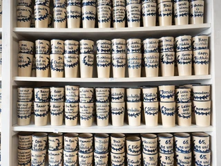 "Bembelina" – that's Monika Maurer's lovely nickname. It is impossible to count how many Bembel she has produced and decorated by hand in her pottery in Sachsenhausen over five decades. Her son is also involved in the business, and one thing is certain: if you want your very own individual Frankfurt souvenir, the Maurer pottery is the right place for you. You can order a pattern, inscription or shape according to your wishes – from mini mugs to 12-liter maxi sizes. The clay comes from the Westerwald and each piece is unique. Pottery is made on the wheel, followed by the handle, decoration and glaze, and the Bembel has to be dried and fired again and again in between.