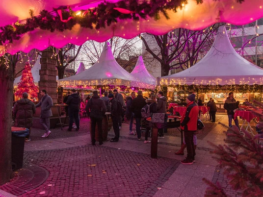 Pink and pink lights shine from Friedrich-Stoltze-Platz, while delicious hot cocktails and homemade soups are offered at the charming wooden huts. The diverse range of vegetarian and vegan dishes is particularly noteworthy. The entire place impresses with its lovingly designed, detailed decoration in pink.
