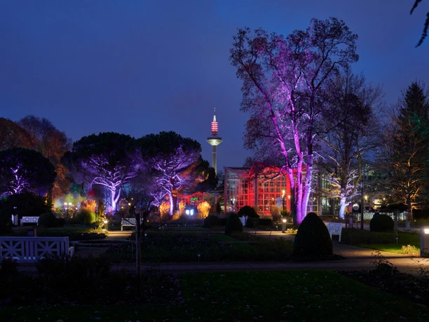 On long winter evenings, illuminations transform the Palmengarten into a unique, glowing garden landscape as darkness falls.