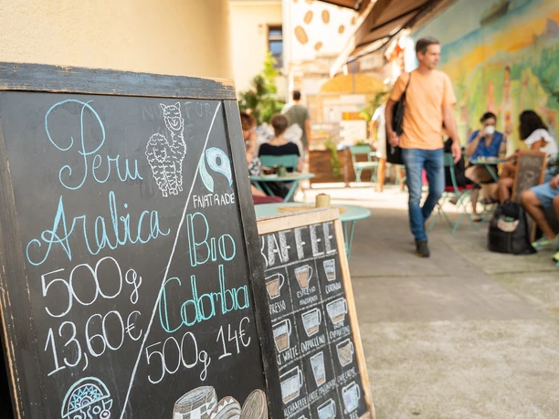 Although it's not at the front of Leipziger Straße, but in a backyard, you can't miss the Wissmüller roastery. You just have to follow your nose, because the smell of freshly roasted coffee will guide you to your destination. Hermann and Hertha Wissmüller founded the family business in the heart of Bockenheim in 1948. Today it is run by the third generation, who are currently lovingly restoring the backyard café. The family's recipe for success: good coffee. To ensure that the flavours develop gently, the beans are roasted in a drum roaster for 10 to 15 minutes at a maximum temperature of 200 degrees. 30 different varieties in antique tins and pots, accessories and various teas are available to take away. Or you can simply sit down in the small courtyard café, where coffee sacks serve as tablecloths and carpets, sit back and enjoy. For example, the popular "Stern Espresso" and a slice of homemade cake.