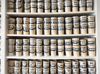"Bembelina" – that's Monika Maurer's lovely nickname. It is impossible to count how many Bembel she has produced and decorated by hand in her pottery in Sachsenhausen over five decades. Her son is also involved in the business, and one thing is certain: if you want your very own individual Frankfurt souvenir, the Maurer pottery is the right place for you. You can order a pattern, inscription or shape according to your wishes – from mini mugs to 12-liter maxi sizes. The clay comes from the Westerwald and each piece is unique. Pottery is made on the wheel, followed by the handle, decoration and glaze, and the Bembel has to be dried and fired again and again in between.