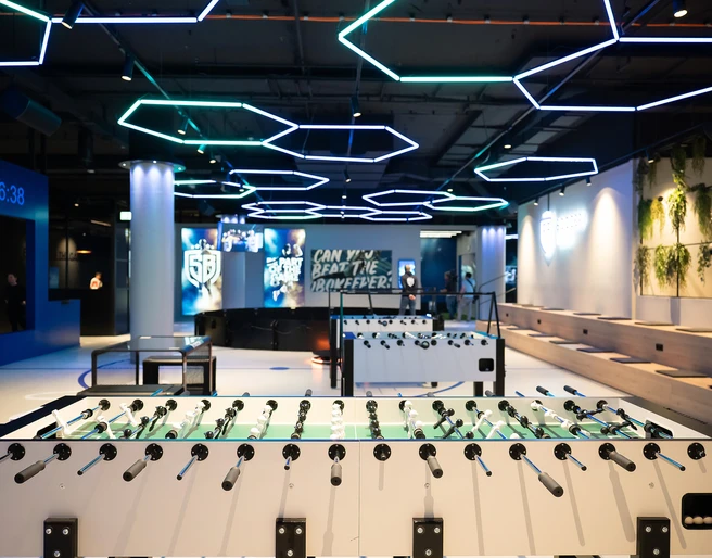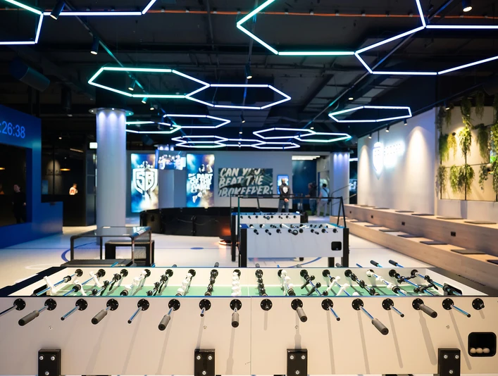At Poolball, for example, you combine football and billiards and kick the round balls into the round on an oversized pool table. In the "Bolzbox", you play one against one on a one square metre field. There are also various e-sports games and a lightning-fast robo-keeper against whom you can place your shots on goal and who, according to the operators, has already been beaten by the likes of Messi, Griezmann and Neymar. The game is always played here, of course: 90 minutes and there's a sports bar right next door for partying afterwards.